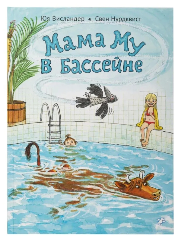 На ферме все как обычно. Только Мама Му опять затеяла необычное: вместе с фермерской дочкой Линой она отправляется в бассейн. А почему бы и нет, ведь она любит все новое. Ее друг ворона Кракс недоумевает, ведь коровы не ходят в бассейн, к тому же там мокро! Но Маму Му не остановить - и вот она уже наслаждается водными развлечениями: ныряет, скатывается по трубе и парится в бане. А еще она получает приз за то, что проплыла 25 метров. Вернувшись на ферму, она рассказывает Краксу про свои достижения, но тот грустит, потому что он не умеет плавать. И тогда Мама Му и Лина устраивают вороне свои соревнования, и Кракс получает заслуженный приз. Вкратце: Иллюстрации Свена Нурдквиста - автора книг про Петсона и Финдуса. Книга помогает морально подготовиться к походу в бассейн. Если у тебя что-то не получается в одном деле, этот вовсе не значит, что не получится в другом. Вы когда-нибудь видели корову в бане? Для кого: Для чтения взрослыми детям в возрасте от 3 лет. О серии: Каждая книга о Маме Му и ее друге Краксе - это забавная история о любознательной и задумчивой корове и ее друге воро?не. Герои оказываются в ситуациях, с которыми сталкиваются дети, - идут в бассейн, катаются на снегокате, учатся читать, - и познают мир вместе с читателями. Книги про Маму Му и Кракса переведены на тридцать языков и известны во всем мире. Их авторы - Юя Висландер, почетный член шведской Академии детской книги, и Свен Нурдквист, художник, получивший мировую известность благодаря книгам о Петсоне и Финдусе. Многие книги серии публикуются в России впервые. Переиздания опубликованы в новом переводе, формат книг приближен к оригиналу (такой же, как в серии о Петсоне и Финдусе). Серия регулярно пополняется новыми книгами. Компьютерные игры про Маму Му и Кракса переведены на русский язык, также существуют театральная постановка и полнометражный мультфильм. Отзыв критика: Мама Му - отличный пример для подражания. Жить в свое удовольствие - вот ее девиз. Катя Медведева. «Как надо». Об авторах: Свен Нурдквист родился в городе Хельсингборге. Уже в пятнадцать лет он знал, что будет художником. Поэтому, учась на архитектора, он одновременно ходил на курсы по искусству и рисованию. Поначалу Свен Нурдквист создавал иллюстрации к школьным учебникам. А от учебников недалеко и до детских книг. Работы Нурдквиста участвуют во многих международных выставках. Юя Висландер - шведская детская писательница. Наиболее известна как автор серии рассказов о любознательной корове Маме Му и философствующей вороне Краксе с иллюстрациями Свена Нурдквиста. Юя придумала персонажей вместе с мужем Томасом. Мама Му и Кракс появились как герои радиоспектакля и детских песен, и лишь в 1991 году вышла первая книга.