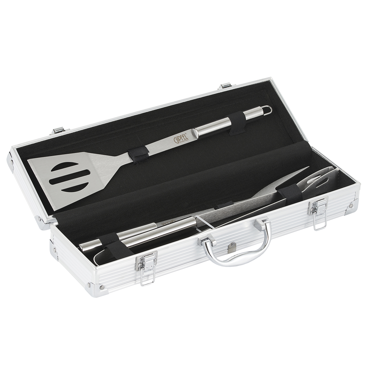 Набор для барбекю GIPFEL BRIG . Набор состоит из 3 предметов в алюминиевом кейсе. В наборе: лопатка 37 см, щипцы 37 см, вилка для мяса 37,5 см. Толщина инструментов 1,5 мм. Инструменты сделаны из нержавеющей стали.