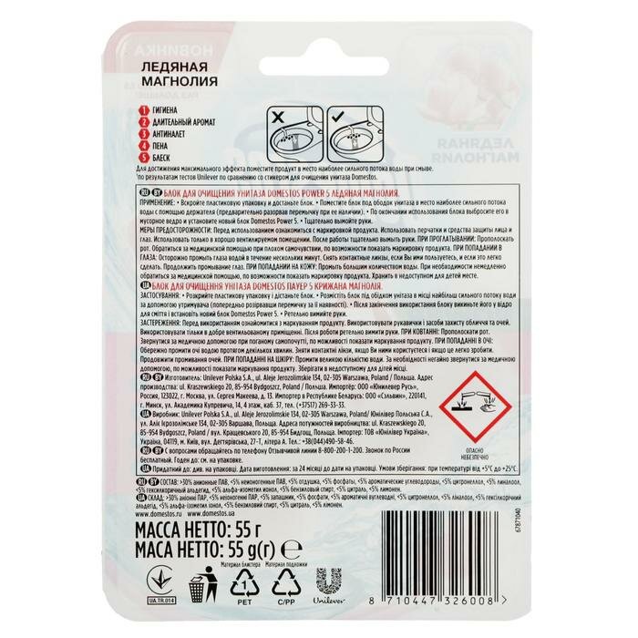 Туалетный блок Domestos Power 5 Ледяная магнолия, содержащий активный хлор, известный своими дезинфицирующими свойствами. Domestos Power 5 - это сила пяти компонентов: обильная пена, предотвращение известкового налета, длительный аромат, блеск, гигиена. Для достижения максимального эффекта поместите продукт в место наиболее сильного потока воды при смыве.