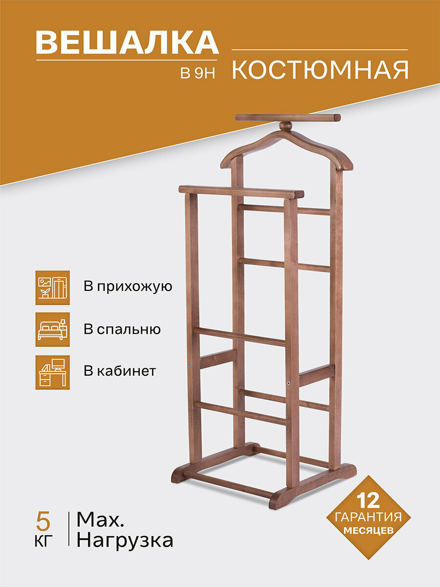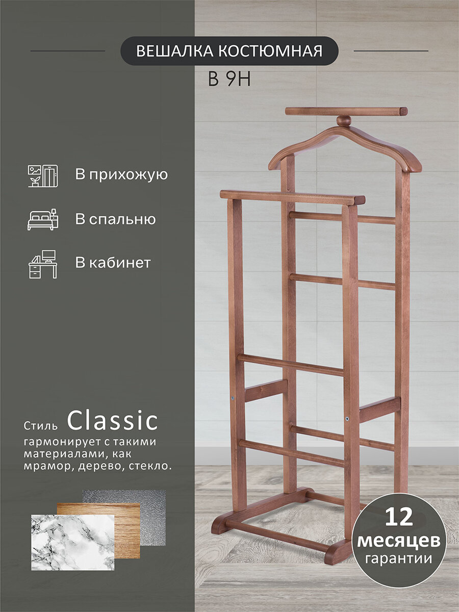 Если у вас еще нет костюмной вешалки, то не сомневайтесь в полезности ее приобретения. Данная модель в отличие от модели В6Н дополнена второй стойкой, на которой расположена перекладина для брюк, это может быть иногда удобнее. Вешалка полностью изготовлена из массива дерева, имеет классический вид, надежна и экономична. Необычную форму плечиков позволила воспроизвести технология гнуто-клееного шпона. За вешалкой очень просто ухаживать. Вешалка компактно упакована, имеет небольшой вес, так что ее можно транспортировать даже в общественном транспорте, не говоря о личном или грузовом.