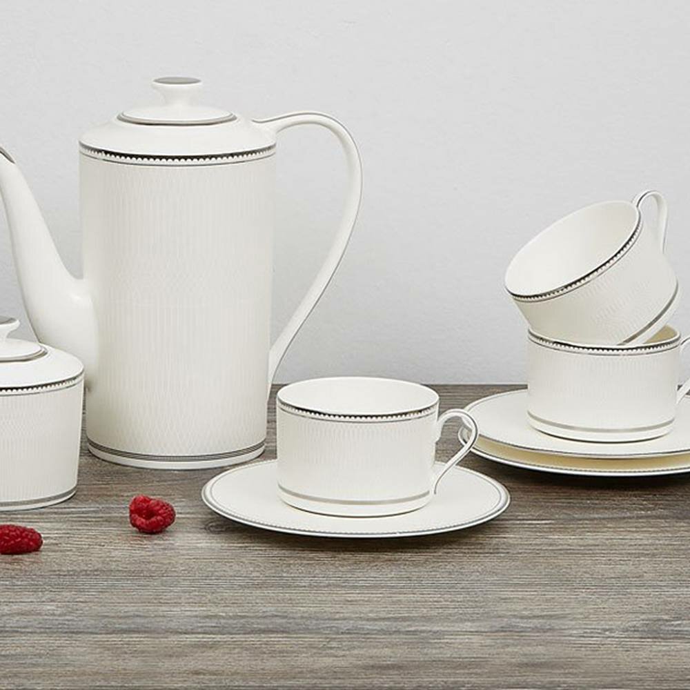 "Жемчуг" - название серии как нельзя лучше отражает ее основную особенность – молочно-белую глянцевую поверхность, своим блеском и сиянием так напоминающую перламутр. Геометричный декор представляет собой сложное переплетение линий и создает ощущение бесконечности и многогранности композиции. Серебряная резная отводка по краю придает предметам коллекции благородный вид.