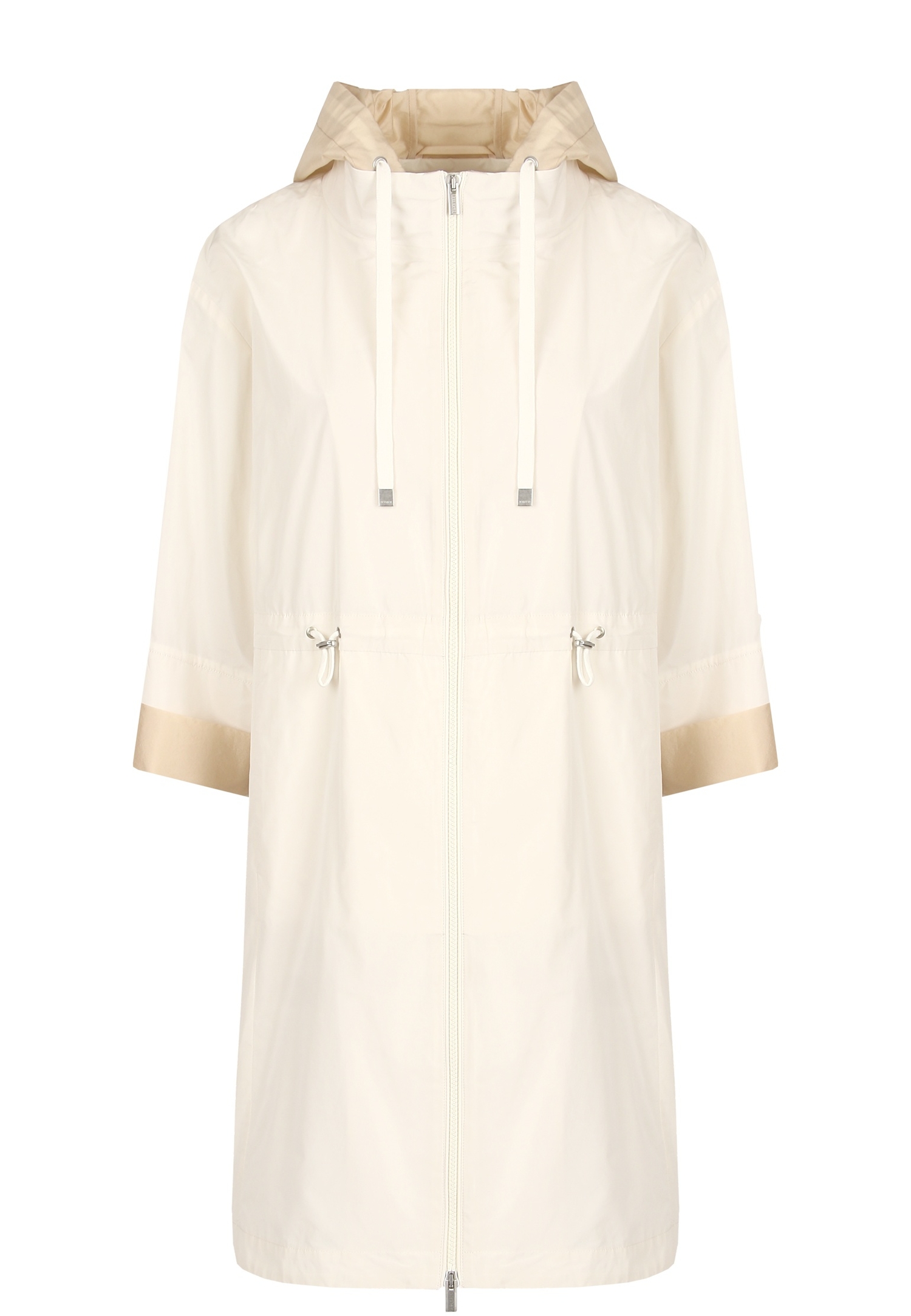 Создавая свободную парку в стиле спорт-шик из новой коллекции, дизайнеры марки сыграли на контрасте цветов. Для пошива плаща с рукавами ¾ использовали гладкий матовый полиамид молочного цвета, а глубокий капюшон и манжеты выполнили в нежном оттенке крем-брюле. Шнурки с фиксаторами, продетые в кулиски на талии, позволяют изменять силуэт по желанию. Модель застегивается водонепроницаемой двусторонней молнией. Идеальное завершение весеннего образа в пастельных тонах.
