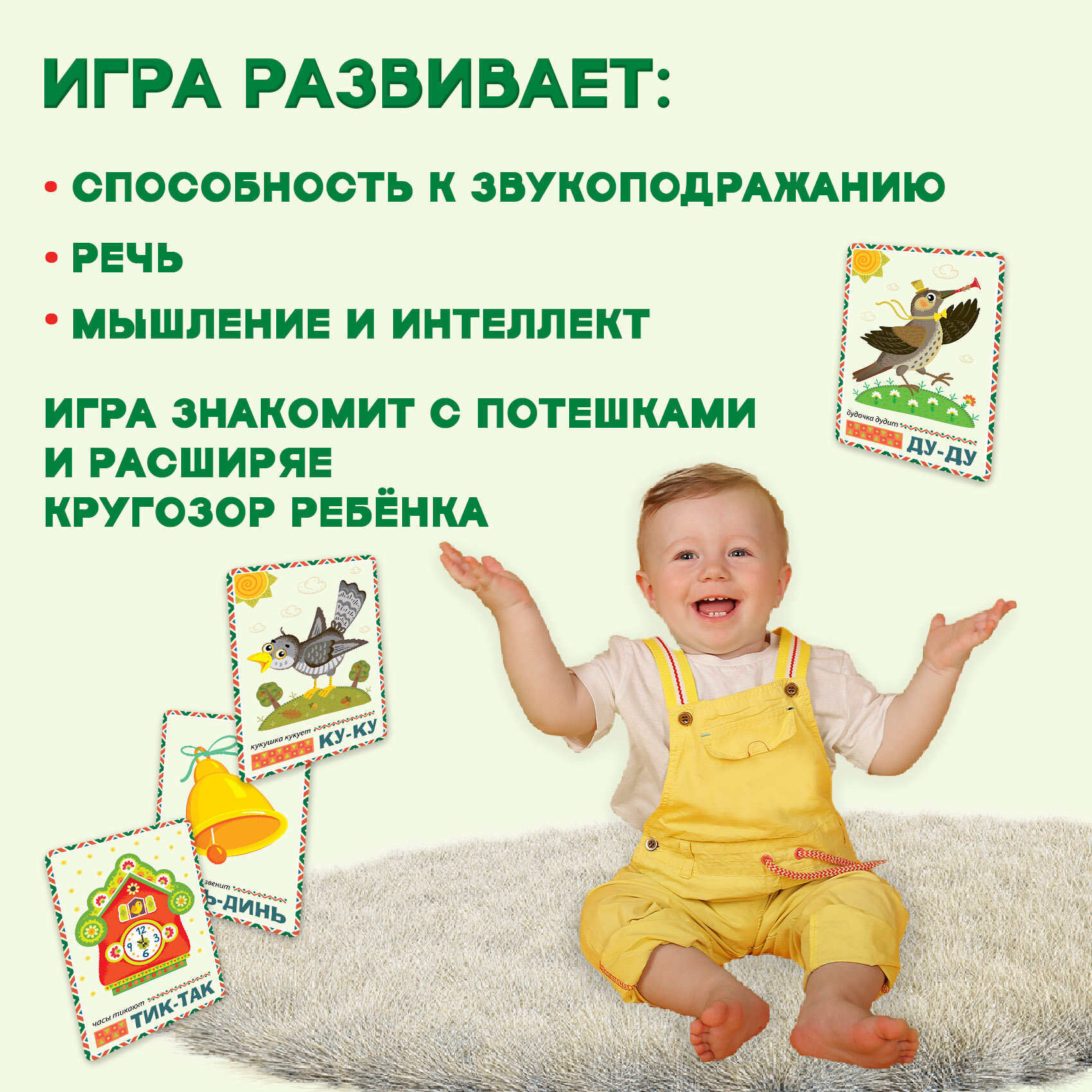 В наборе 50 карточек: с подражанием животным или предметам ("гав-гав", "му-му", "ту-ту") и с действиями ("на", "дай", "топ-топ"). Карточки двусторонние - на одной стороне дана иллюстрация и пример звукоподражания, а на другой - тематическая потешка. Мама может прочитать ребёнку потешку, а затем, перевернув карточку, показать животное, про которое была потешка, и побудить ребёнка повторить звуки, которые издаёт это животное. Подобные занятия помогут малышу начать говорить.