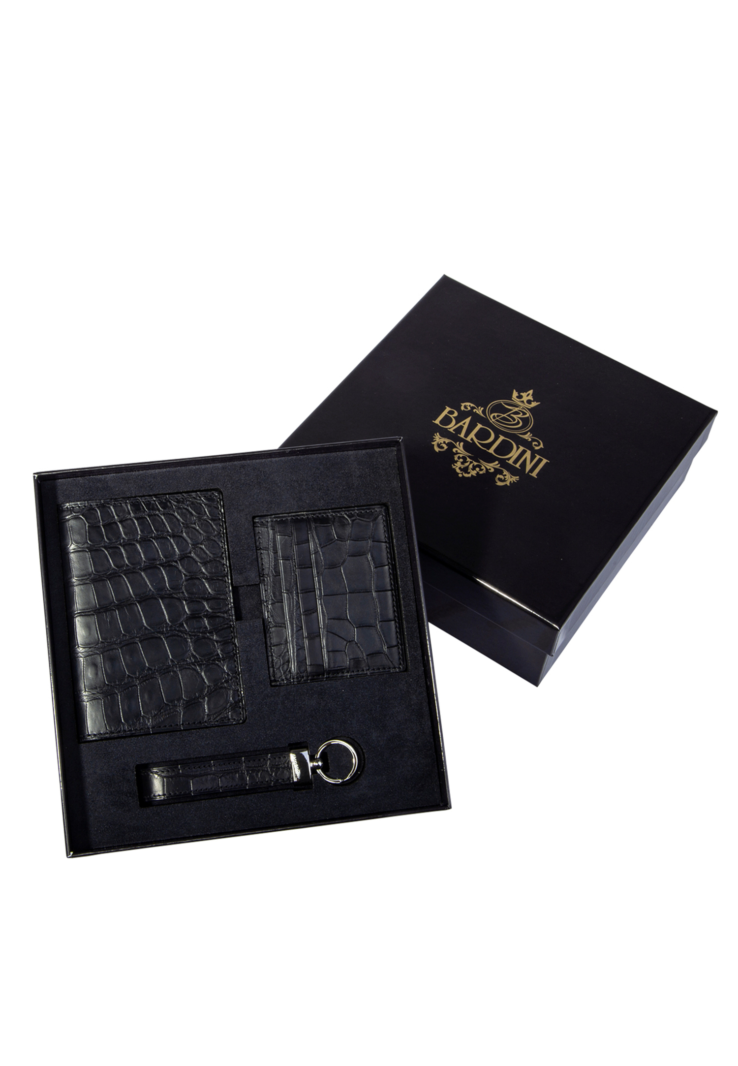 Подарочный набор Bardini подойдет в качестве подарка на юбилей, корпоративный или календарный праздник и любое другое важное событие в жизни человека и компании. Аксессуары (обложка на паспорт, картхолдер, брелок) выполнены из высококачественной кожи крокодила итальянского производства черного цвета.