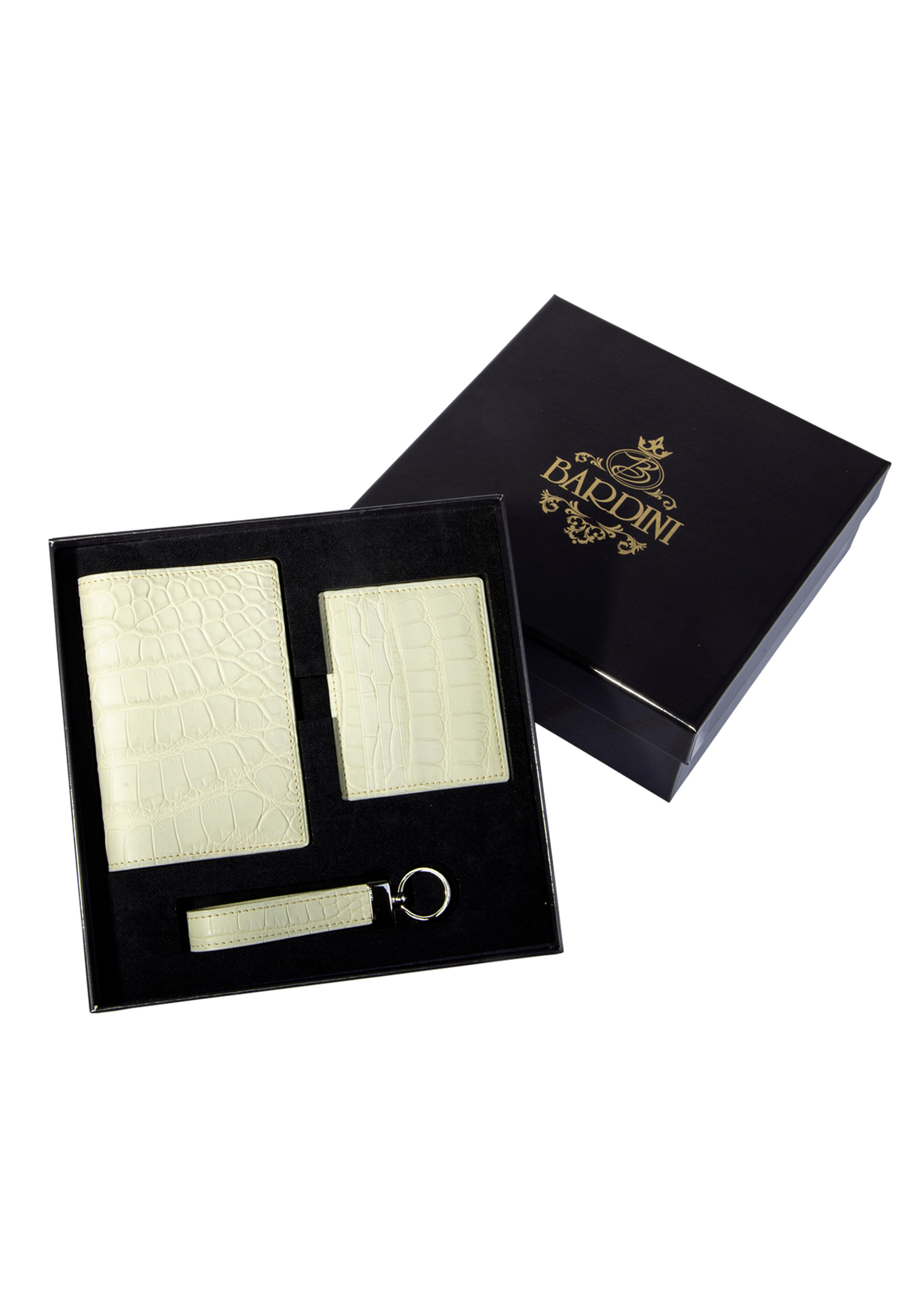 Подарочный набор Bardini подойдет в качестве подарка на юбилей, корпоративный или календарный праздник и любое другое важное событие в жизни человека и компании. Аксессуары (обложка на паспорт, картхолдер, брелок) выполнены из высококачественной кожи крокодила итальянского производства мистического белого цвета.