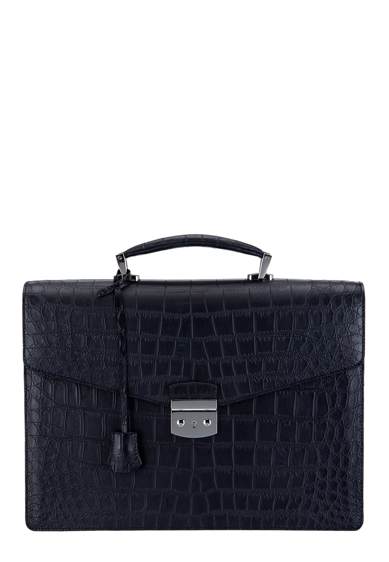 Портфель выполнен из высококачественной кожи крокодила итальянского производства черного цвета. Вместительный портфель дополнен удобной ручкой и отличается особой прочностью и долговечностью. Классический дизайн подчеркивает благородный цвет и уникальный рисунок кожи.