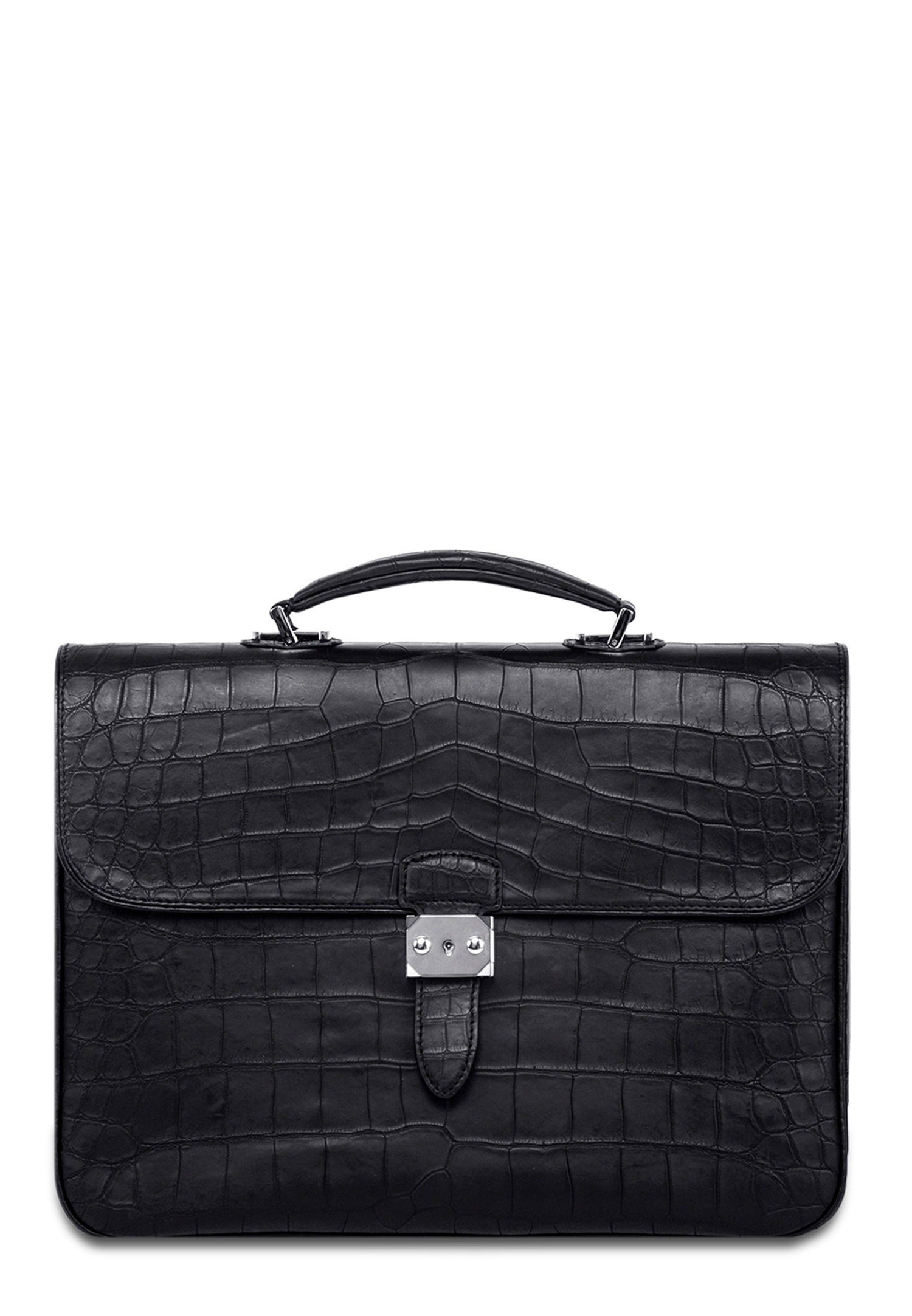 Портфель выполнен из высококачественной кожи крокодила итальянского производства черного цвета. Вместительный портфель дополнен удобной ручкой и отличается особой прочностью и долговечностью. Классический дизайн подчеркивает благородный цвет и уникальный рисунок кожи.