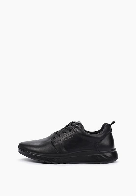 Удобные черные кроссовки для мужчин. Верх выполнен из мягкой натуральной кожи. Текстильная подкладка и кожаная стелька обеспечивают комфортиный микроклимат внутри пары. Утолщенная подошва из ТПУ отличается прочностью и хорошо амортизирует нагрузку. Модель фиксируется на ноге прочной шнуровкой.