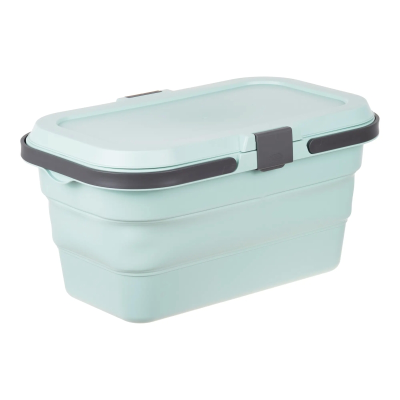 **Корзина для пикника Флекс** изготовлена из полипропилена цвета морской волны. Имеет складную конструкцию, полипропиленовый корпус и полипропиленовую крышку. Корзина оснащена удобными ручками для переноски и подходит для хранения и транспортировки продуктов и посуды во время отдыха на природе.