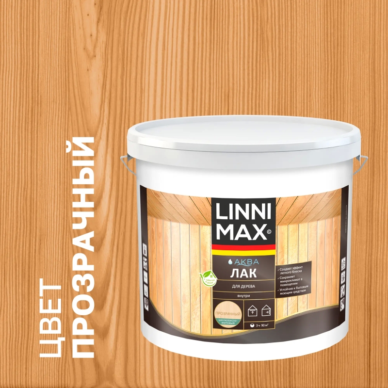 **Лак для дерева Linnimax** — специальный состав, произведенный на акриловой основе, который позволяет получить прочное и защитное покрытие. Наносится на паркетные и деревянные полы, различные предметы мебели и прочие поверхности из дерева внутри помещения. После высыхания покрытие из лака легко моется и очищается, что позволяет регулярно поддерживать здоровый климат в доме. Кроме того, пленка, формируемая данной продукцией, приобретает особую прочность к ударам и царапинам. Природный воск в составе лака способствует созданию грязе- и водоотталкивающего барьера. Перед применением необходимо удалить старые непрочные покрытия, любые загрязнения, а также пыль и смолу. Прочные старые слои из лака рекомендуется отшлифовать до матового состояния. Перед использованием и в процессе работы лак следует тщательно перемешивать. Наносить состав следует валиком или кистью. Оптимальное количество слоев — 2-3. Наносить при температуре не ниже 5°C.