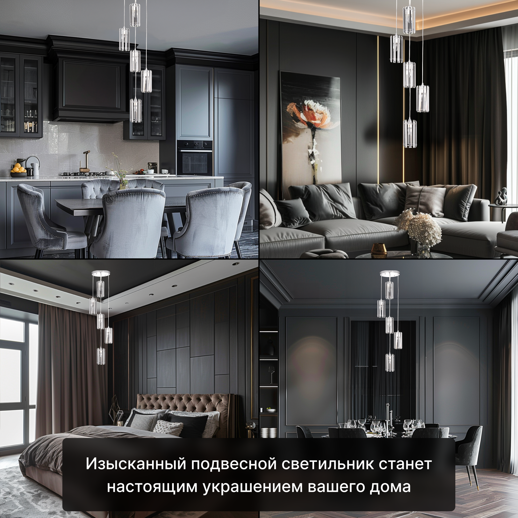 Подвесной хрустальный светильник Citilux Джейн выполнен в современном стиле. Он имеет металлическое основание круглой формы и глянцевое хромированное покрытие. Особенностью данной модели являются пять хрустальных подвесных плафонов, ниспадающие изящным каскадом. Каждый плафон цилиндрической формы, крупные хрустальные элементы кристально прозрачные с современной огранкой.В изделии 5 ламп с цоколем Е14 максимальной мощностью для ламп накаливания 60Вт (в комплект не входят, приобретаются отдельно). Люстра подходит для общего и дополнительного освещения помещений как с высокими, так и с низкими потолками. Высота легко регулируется при установке, тип крепления – планка.Изумительный подвесной светильник Ситилюкс Джейн потрясающе выглядит в модных интерьерах стильных современных квартир, студий, апартаментов и уютных загородных домов. Ярко осветит гостеприимную кухню, аккуратную спальню, небольшую столовую и кабинет. Поможет легко создать атмосферу изысканности в популярных кафе и ресторанах.