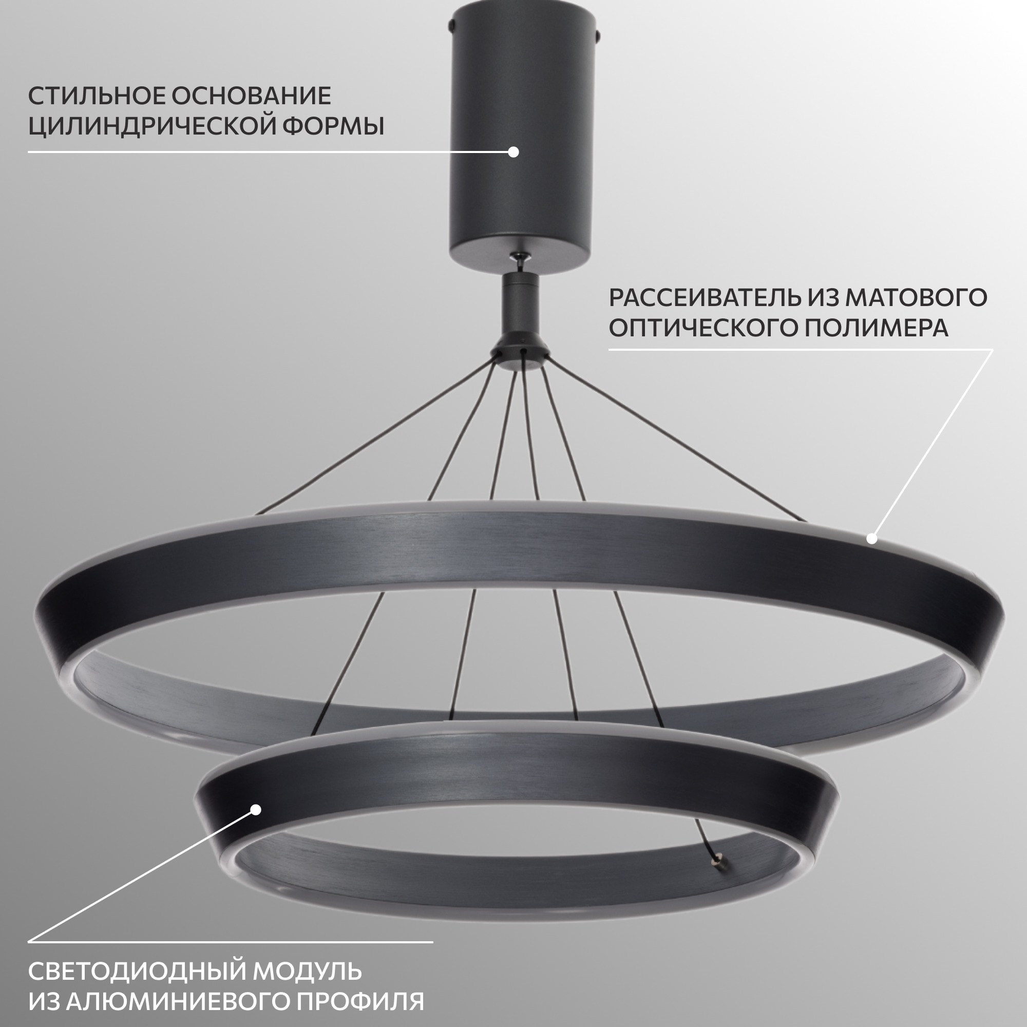 Светодиодная люстра с двумя подвесными кольцами Citilux Tavi выполнена в современном стиле. Каждое кольцо - светодиодный модуль, изготовленный из алюминиевого профиля благородного серого цвета, рассеиватель из матового оптического полимера. Наличие источников света с двух сторон профиля позволяет равномерно осветить всё помещение.Мощность изделия 80Вт, световой поток 5000Лм, цветовая температура 4000К – нейтральный белый свет. Мягкий комфортный свет, безопасный для глаз, без мерцания и пульсаций. Высота светильника легко регулируется при установке, что позволяет использовать его в помещениях как с высокими, так и с низкими потолками. Крепление подходит для всех видов потолков, в том числе натяжных, тип крепления – планка.Кольцевая люстра Ситилюкс Tavi отлично справиться с задачей основного освещения стильной гостиной, модной спальни, уютной кухни и строго кабинета. Потрясающе выглядит над столом, прекрасно осветит зону отдыха.