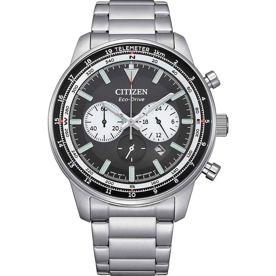 Мужской кварцевый хронограф. Часы оснащены системой Eco-Drive не требующей замены батарейки. Питание от солнечной энергии, запас хода 9 месяцев. Функция предотвращения перезарядки. Функция индикации заряда (EOL). Калибр механизма Citizen B620. Центральные часовая и минутная стрелки, секундная стрелка вынесена на малый циферблат. Апертура даты между 4 и 5 часами. 12/24х часовой формат времени. Секундомер. Тахиметр. Черный циферблат. Круглый корпус выполнен из нержавеющей стали. Диаметр корпуса составляет 44 мм, толщина 13 мм. Стальной браслет, раскладывающаяся застежка. Прочное минеральное стекло устойчивое к мелким механическим повреждениям. Водостойкость WR 100 (плавание без погружения). Вес примерно 165 г.