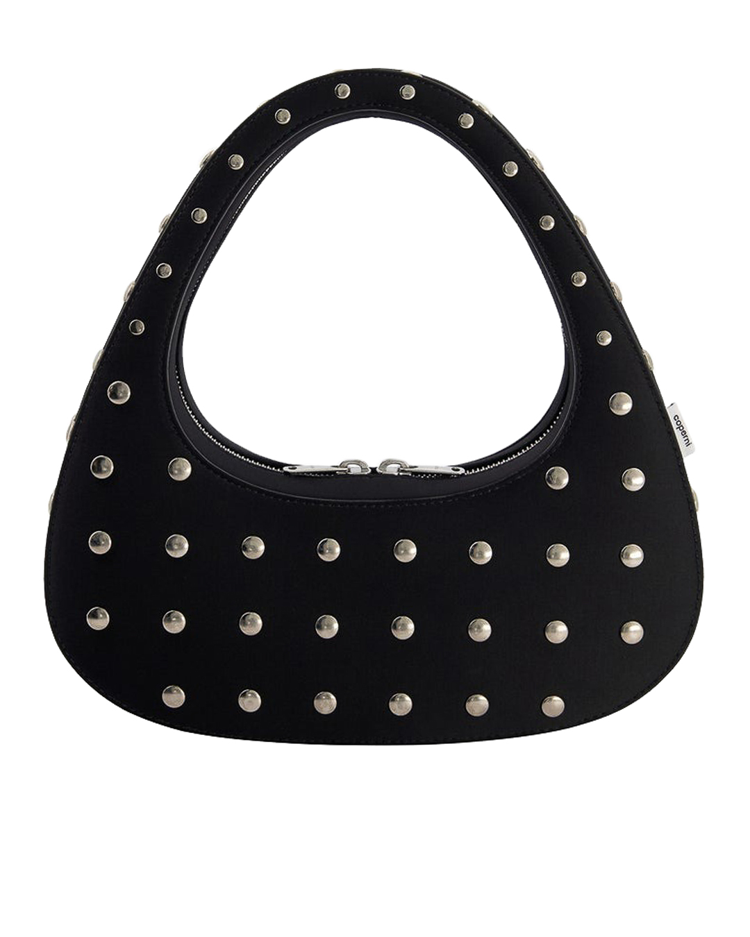 Сумка Baguette Swipe предлагает более скульптурный взгляд на классические багетные стили, вместо прямоугольной формы сумка и ручка объединяются, чтобы создать каплевидную форму с полым овальным центром. Гладкая итальянская черная кожа декорирована заклепками, она легко носится на сгибе руки. Альтернативно, ее можно носить через плечо благодаря съемному кожаному ремешку в тон.