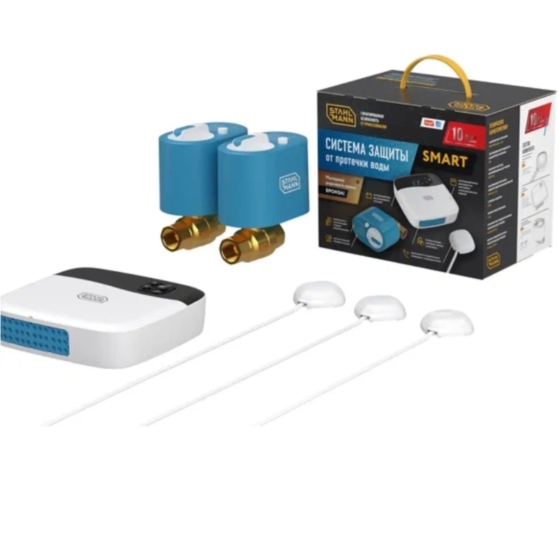 **Система контроля протечки воды Stahlmann Smart ½** – универсальная система защиты от протечек воды с возможностью интеграции в системы диспетчеризации. Предназначена для защиты от затопления помещения водой в случае возникновения аварии в системах водоснабжения и отопления. Оснащена встроенным экраном для удобства настройки и использования модуля. Поддерживает работу с проводными и беспроводными датчиками. Шаровой кран системы выполнен из бронзы. Это довольно твердый, пластичный и устойчивый к коррозии материал. В комплекте модуль управления и датчик протечки. Система такого типа может использоваться в жилом, коммерческом и промышленном секторах. Также ее используются совместно с умным домом. Дополнительной особенностью системы является наличие встроенного источника бесперебойного питания, который позволяет предотвратить протечку даже в случае отключения электричества.