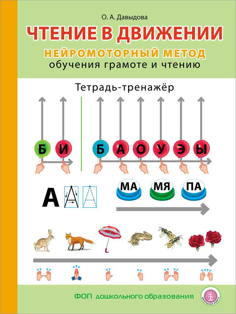 Давыдова О.А.ЧТЕНИЕ В ДВИЖЕНИИ. Неиромоторныи метод обучения грамоте и чтению. для занятий с детьми от 4 лет М.: Школьная Книга, 2024. 6090/8 (215х290) 80 с.: цв.илл.ISBN 9785000132753Обучающая «Чтение в движении» подготовлена в соответствии с требованиями ФОП ДО и с учётом действующих программ воспитания и обучения детей от 4 лет на начальном этапе подготовки к школе. Базовый принцип обучения, представленный автором, сочетание классических и современных технологий психофизиологии, логопедии и нейропсихологии. Такое сочетание звукового аналитико-синтетического метода (звукобуквенный анализ: звук буква слог слово предложение) и нейромоторной методики (упражнения на вдох-выдох с синхронизаций слитного произношения букв слога (затем слогов, слов) с одновременным или поочерёдным движением рук, на повторение по заданной схеме ритмического рисунка с одновременным называнием слогов и картинок и движением рук и т. д.), нацеленной на развитие и оптимизацию работы центральной нервной системы, способствует успешному овладению детьми первоначальных навыков чтения и грамоты, развитию речи, внимания памяти, когнитивных (познавательных) способностей, а также благотворно влияет на предупреждение нарушений чтения (дислексии) и письма (дисграфии).Содержит свыше 220 фонематических и графических заданий и упражнений на все буквы алфавита (в том числе йотированные Е, Е, Ю, Я, мягкий (Ь) и твёрдый (Ъ) знаки), направленных на развитие у дошкольников зрительно-моторной координации, дифференциацию речевых звуков, формирование зрительного восприятия буквы, автоматизацию навыков чтения и т. д.Задания детям читает взрослый. Все графические упражнения выполняются простым карандашом. В заданиях на звуковой или буквенный анализ используются цветные карандаши: красный для дифференциации гласных звуков и их букв, синй для дифференциации твёрдых согласных звуков и их букв, зелёный для дифференциации мягких согласных звуков и их букв.Рекомендованы широкому кругу специалистов воспитателям, логопедам, психологам, педагогам предшкольной подготовки, а также родителям для занятий (индивидуальных и групповых) с детьми дошкольного возраста.