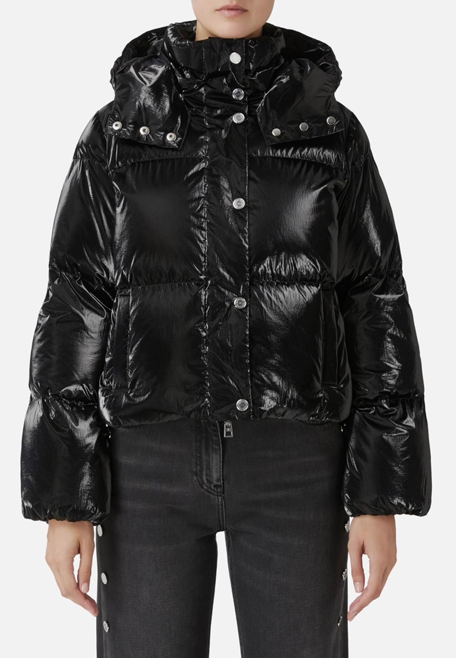 Для пошива укороченного пуховика цвета смолы мастера известного бренда ELISABETTA FRANCHI использовали прочный непромокаемый полиамид с эффектным глянцевым блеском, капли влаги по которой скатываются, не впитываясь. Для большей защиты от холода изделие дополнили объемным капюшоном и слоем отборного пуха с добавлением пера. Высокий воротник-стойка со множественными металлическими застежками придает образу завершенность и дополнительную защиту от холода. Этот пуховик станет незаменимым элементом вашего зимнего гардероба, сочетая в себе итальянскую элегантность и функциональность.