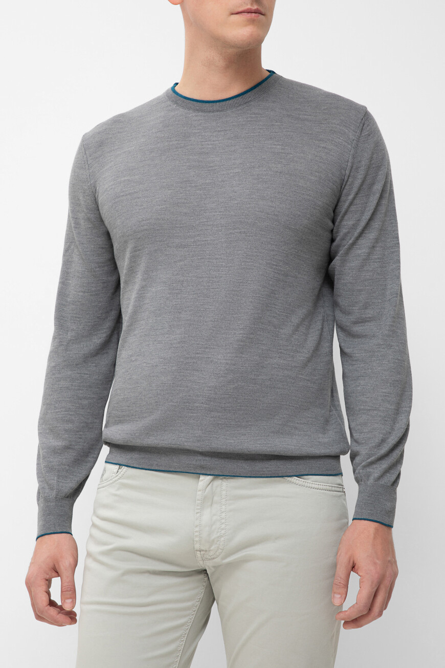 Серый свитер Emiliano Zapata выполнен из натуральной шерсти. Этот материал согревает и вместе с тем пропускает воздух, поэтому в изделии не будет жарко в помещении. Воротник и манжеты деликатно выделили узким синим кантом, придающим модели особое звучание.