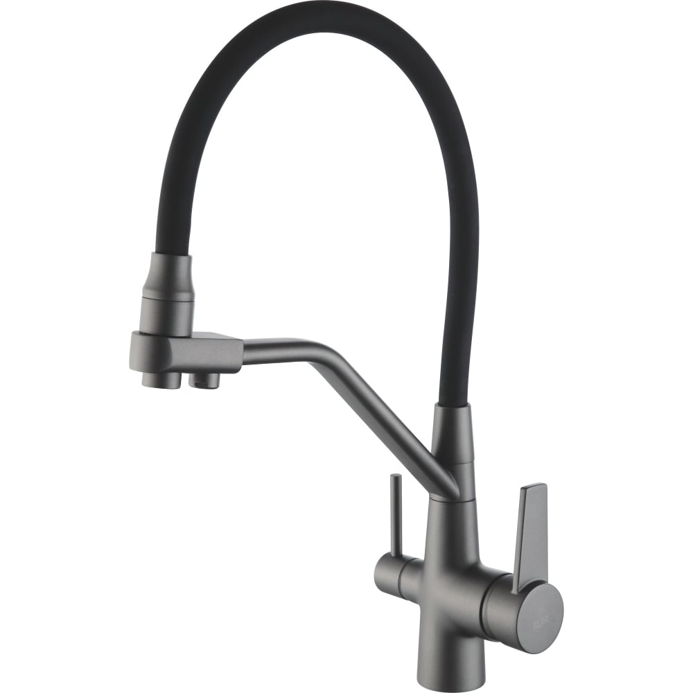 Смеситель для кухни с фильтром для питьевой воды (фильтр приобретается отдельно) и гибким изливом Rose, темно-серый. Смеситель для кухни с подключением к фильтру питьевой воды, изготовлен из высококачественной латуни CW617N. Данный сплав латуни безопасен для здоровья, прочный, стойкий к коррозии. Аэраторы Neoperl (Германия) гарантируют, ровный и мягкий поток воды без разбрызгивания и шума. Смеситель с фильтром комплектуется надежными картриджами 35 мм. SEDAL (Испания), обеспечивающие увеличенный срок службы смесителя. В комплекте идет смеситель для фильтра, набор гибкой подводки 1/2 длинной 500 мм и монтажный набор для крепления смесителя. Смеситель для фильтра питьевой воды имеет два носика излива, для подачи проточной и питьевой воды. В комплект смесителя входит всё необходимое для быстрого и удобного монтажа. Гарантийный срок на данный кухонный смеситель составляет 5 лет.