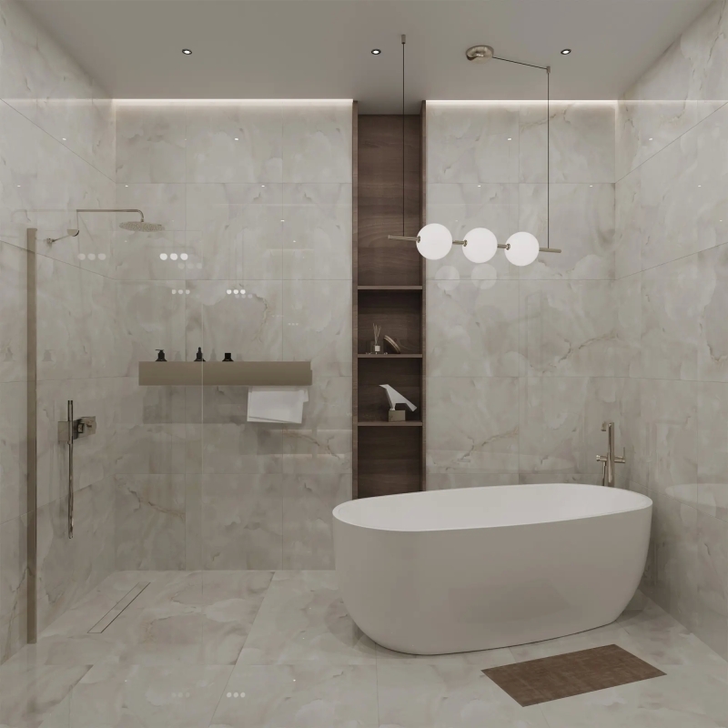 **Глазурованный керамогранит Arcadia Ceramica Onice Pearl Glossy** используется как для отделки стен, так и для укладки на пол. Материал характеризуется высокой прочностью и устойчивостью к механическому воздействию. В процессе производства сырье тщательно перемешивается до однородной структуры, подвергается прессованию под высоким давлением (чтобы избежать образования пор и пустот) и обрабатывается в печи. На завершающем этапе поверхность покрывается специальным составом, который отвердевает в процессе обжига. В результате материал приобретает свой эстетичный и презентабельный внешний вид.