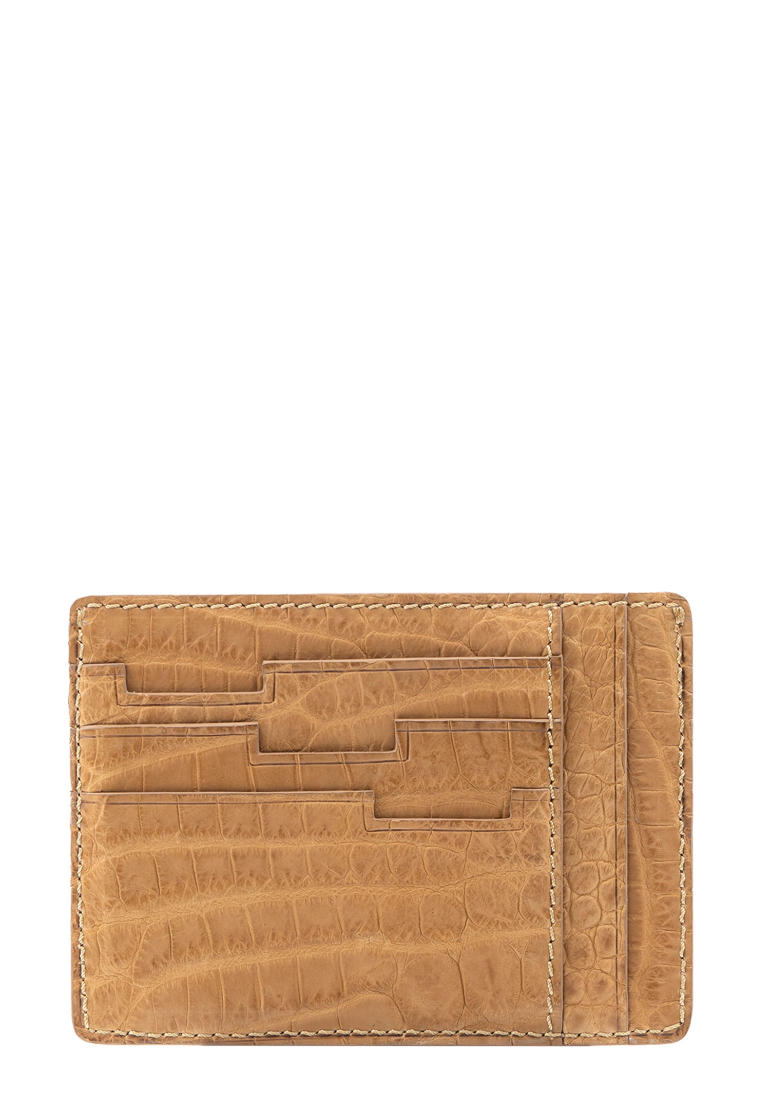 Визитница выполнена из высококачественной кожи крокодила итальянского производства бежевого цвета. Модель отличается наличием 10 слотов для банковских карт и одним карманом для купюр. Классический дизайн подчеркивает благородный цвет и уникальный рисунок кожи. Габариты: Длина 12 см, высота 8.5 см