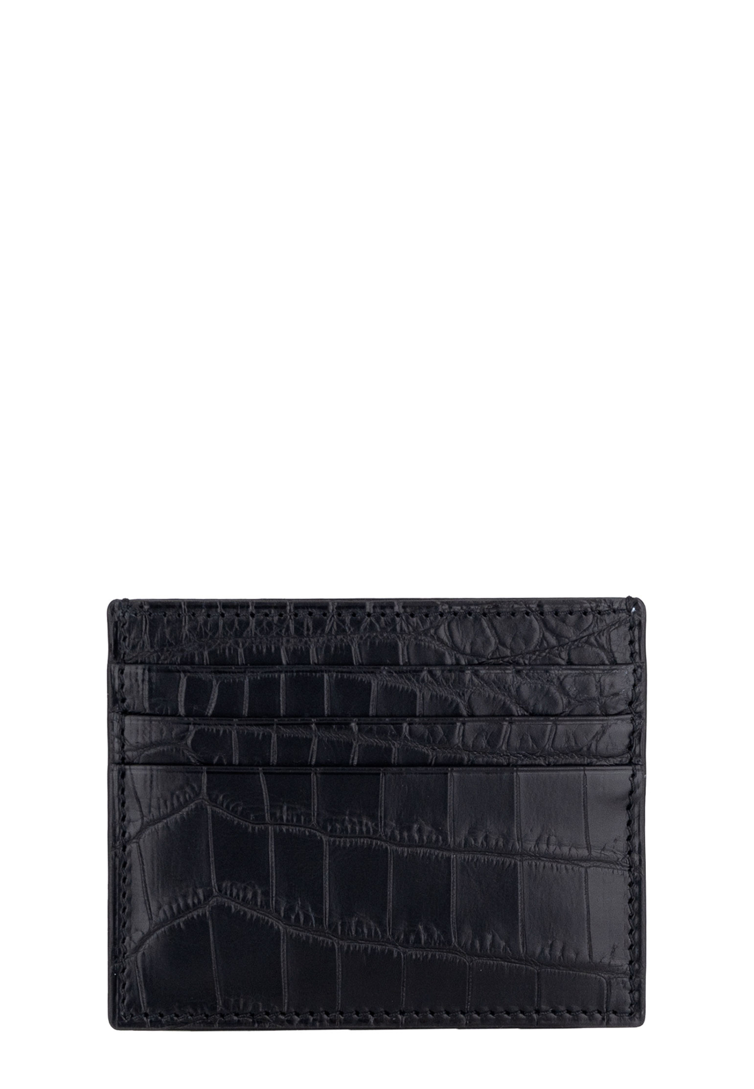 Визитница выполнена из высококачественной кожи крокодила итальянского производства черного цвета. Модель отличается наличием 6 слотов для банковских карт и одним карманом для купюр. Габариты: Длина 10 см, ширина 8 см