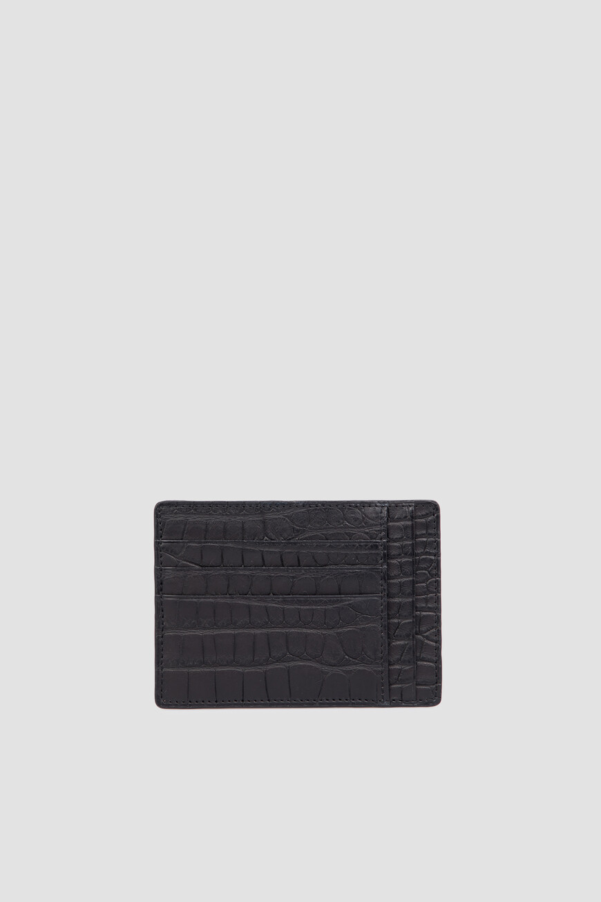 Визитница из фактурной высококачественной кожи крокодила от Bardini. Классический дизайн подчёркивает благородный чёрный цвет и уникальный рисунок кожи. Изделие отличается наличием пяти слотов для кредитных карт и плоским разделительным карманом сверху для купюр. Атрибутом бренда стал золотистый логотип во внутренней части аксессуара.