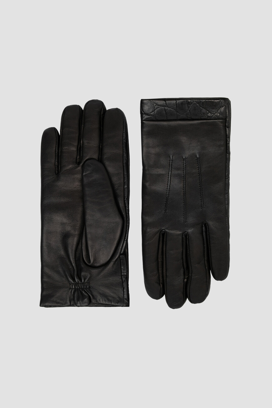 Комбинированные перчатки чёрного цвета от Bardini не теряют со временем форму. Изделие выполнено из мягкой гладкой кожи ягнёнка и дополнено вставками из фактурной кожи крокодила на тыльной стороне и боковинах в тон. Аксессуар с рельефной дизайнерской строчкой фиксируется на руке при помощи сборки на запястье.