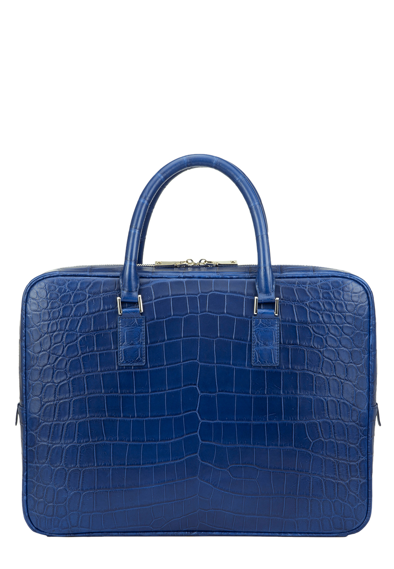 Портфель выполнен из высококачественной кожи крокодила итальянского производства синего цвета. Вместительный портфель дополнен удобной ручкой и отличается особой прочностью и долговечностью. Классический дизайн подчеркивает благородный цвет и уникальный рисунок кожи. Габариты: Длина 40см, Высота 30см, Толщина 8 см.