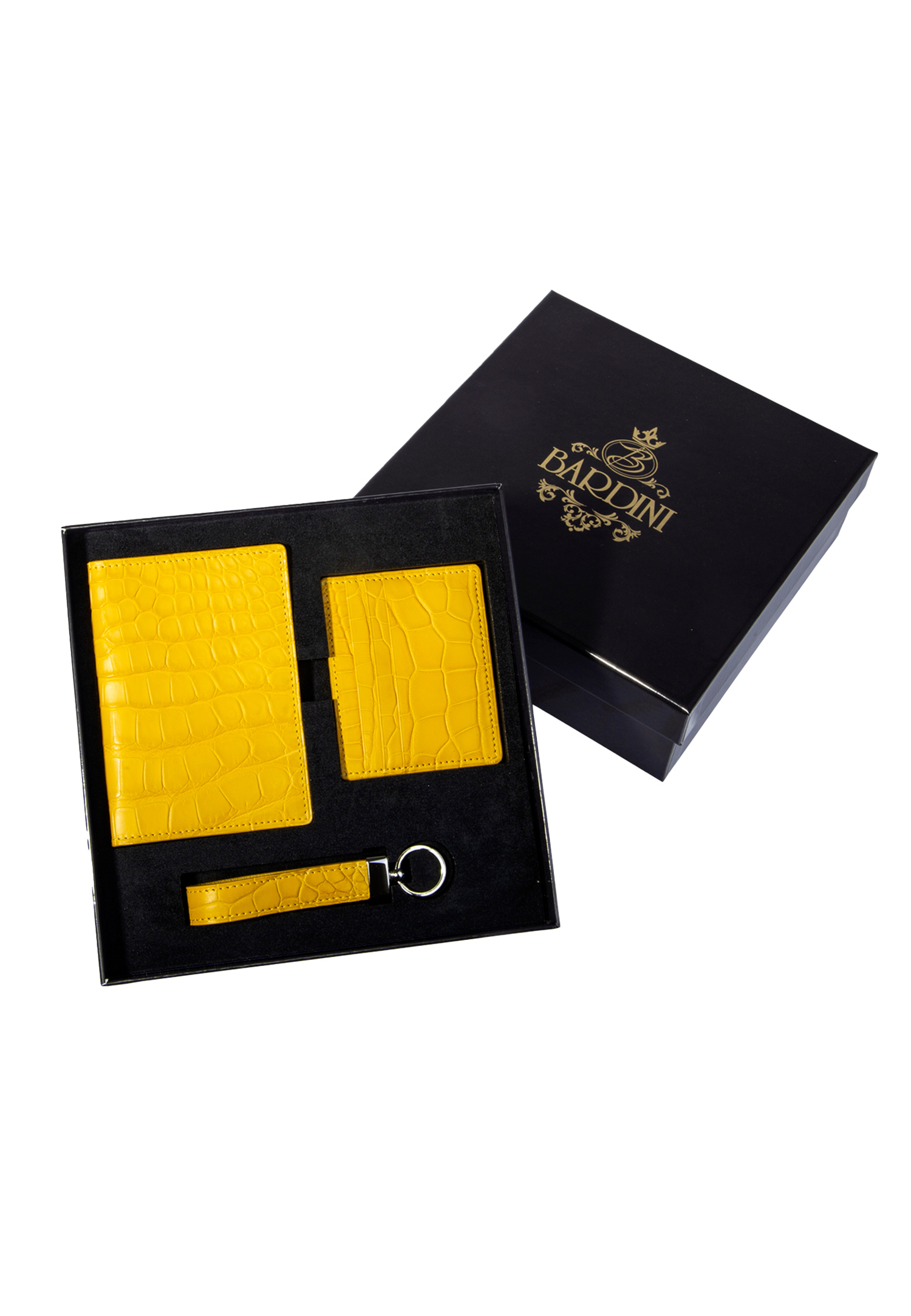 Роскошный подарочный набор от Bardini: обложка для паспорта, визитница и брелок. Предметы ручной работы выполнены из мягкой высококачественной кожи крокодила изысканного жёлтого оттенка. Материал статусный, при этом практичный: прочный, устойчивый к механическим повреждениям. Классический дизайн подчёркивает благородный цвет и уникальный рисунок кожи. Незаменимый аксессуар для современного человека - стильная и практичная обложка для паспорта, конструкция которой обеспечивает лёгкий доступ к страницам документа. Тонкая и изящная визитница из набора легко поместится в любой карман или сумку и позволит удобно хранить банковские карты и визитки. Идеальным дополнением стал лаконичный брелок, который крепится на карабин.