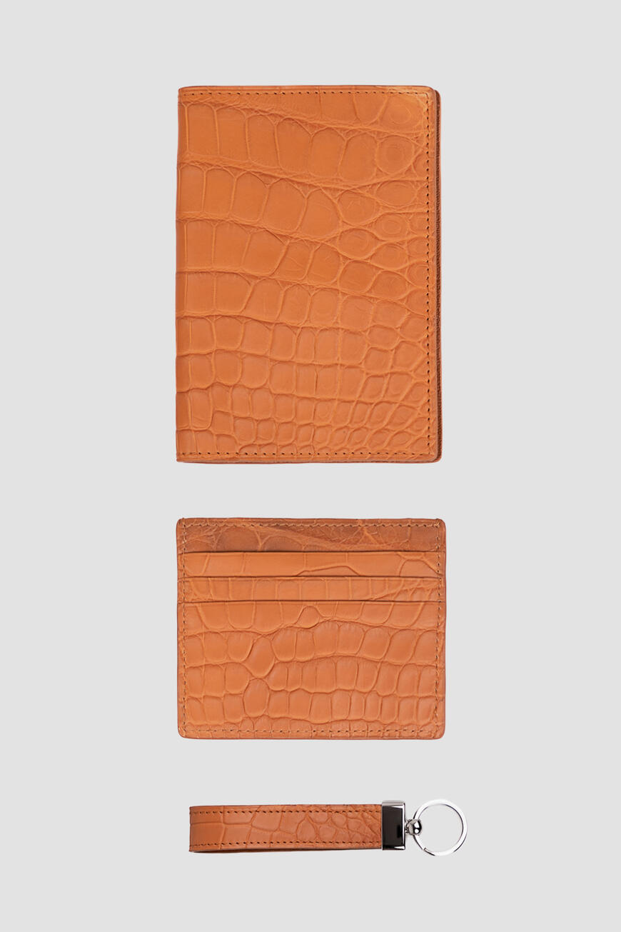 Роскошный подарочный набор от Bardini: обложка для паспорта, визитница и брелок. Предметы ручной работы выполнены из мягкой высококачественной кожи крокодила изысканного оранжевого оттенка. Материал статусный, при этом практичный: прочный, устойчивый к механическим повреждениям. Классический дизайн подчёркивает благородный цвет и уникальный рисунок кожи. Незаменимый аксессуар для современного человека - стильная и практичная обложка для паспорта, конструкция которой обеспечивает лёгкий доступ к страницам документа. Тонкая и изящная визитница из набора легко поместится в любой карман или сумку и позволит удобно хранить банковские карты и визитки. Идеальным дополнением стал лаконичный брелок, который крепится на карабин.