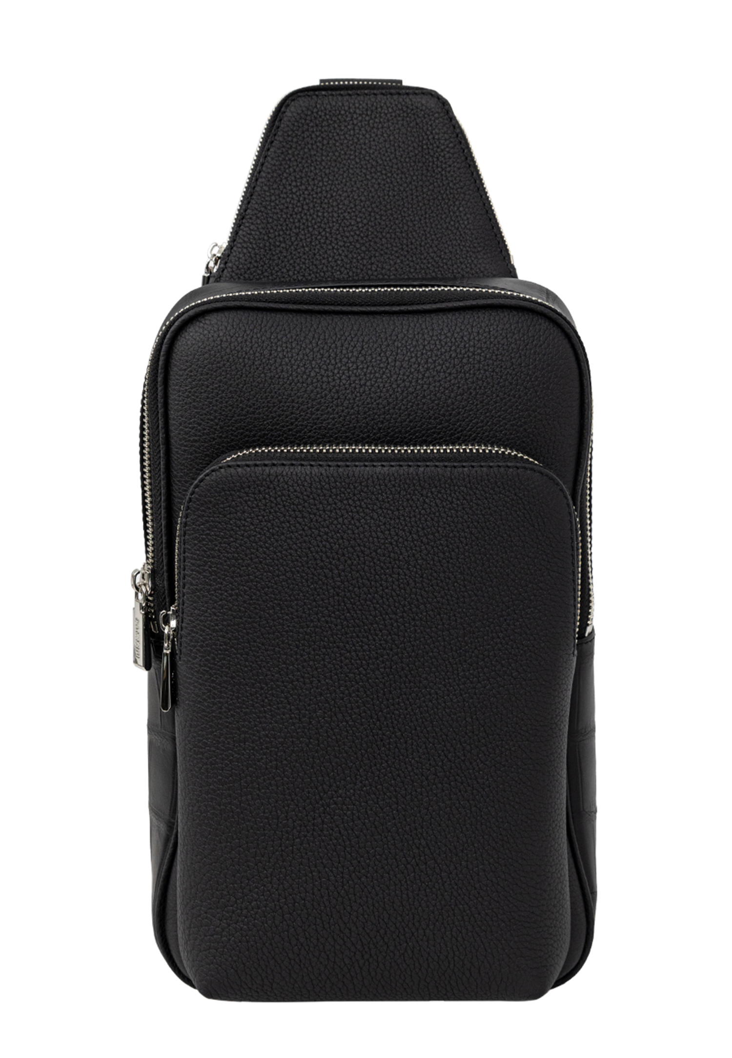 Чёрная сумка-слинг с объёмным внутренним отделением от Bardini. Для создания модели выбрана зернистая матовая кожа телёнка с кантом из фактурной кожи крокодила в тон. Изделие отличается внешним карманом на молнии спереди и брендированием во внутренней части.