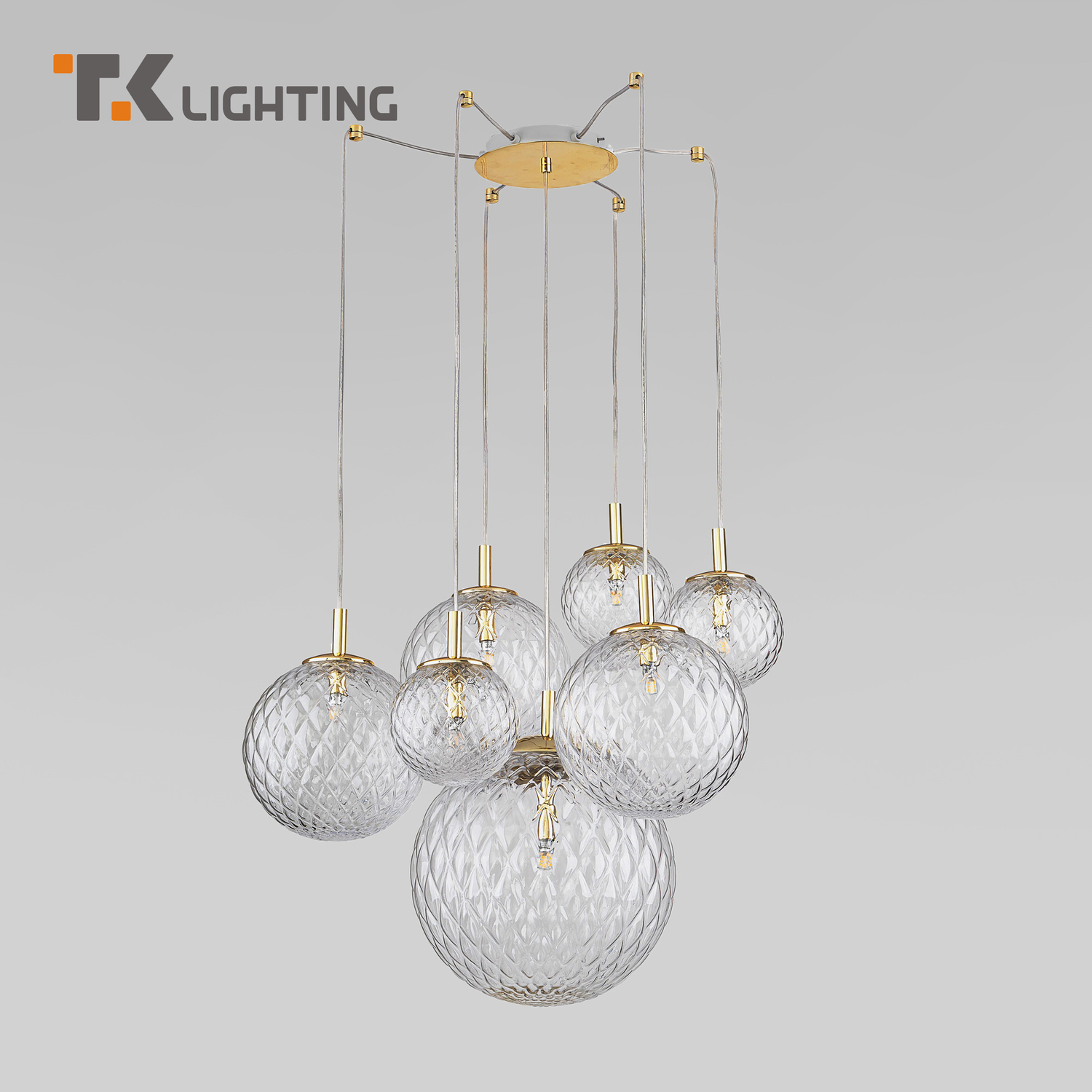 Подвесная люстра на семь стеклянных плафонов TK Lighting Cadix G9 в цвете золото предназначен для создания основного освещения и акцентной подсветки в любом дизайне. Простые минималистичные формы и сдержанные тона станут идеальным дополнением для вашего интерьера.В качестве источника света используются сменные лампы с цоколем G9, питание от сети 230В, 50Гц. Патрон рассчитан на максимальную мощность 8Вт и поможет создать качественное освещение на площади 9м.кв.Благодаря стеклянному фактурному плафону светильник создает мягкое рассеянное свечение. Прочный металлический корпус светильника устойчив к механическим воздействиям, а защитное покрытие обеспечивает надежную электроизоляцию и презентабельный внешний вид.Подвесная люстра оснащена системой регулировки высоты подвеса, позволяющей размещать изделие на разных уровнях, уменьшая или увеличивая угол рассеивания светового потока. Светильник легко устанавливается на любых потолках при помощи монтажной планки.Серия светильников Cadix выполнена в цвете золото состоит из подвесных люстр на 1 и 7 плафонов различных диаметров.Важно! Лампочки в комплект не входят и докупаются дополнительно в зависимости от желаемой цветовой температуры (теплый, холодный свет).