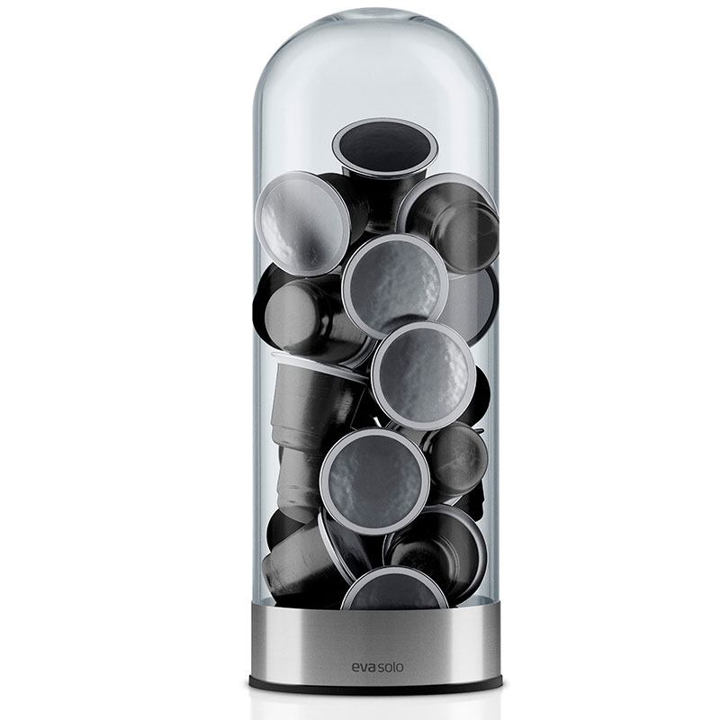 Диспенсер для кофейных капсул от Eva Solo - это элегантный способ их хранения. Колба цилиндрической формы позволяет определить, сколько ярких капсул остаётся внутри. Основа включает в себя мягкий сликоновый клапан, который удерживает капсулы, но легко позволяет доставать их по одной. Если диспенсер нужно пополнить, просто снимите основу и вставьте до 25 капсул в контейнер. Смешивайте разные цветные капсулы в одном диспенсере, или поставьте несколько диспенсеров рядом, каждый со своими капсулами определённого цвета.