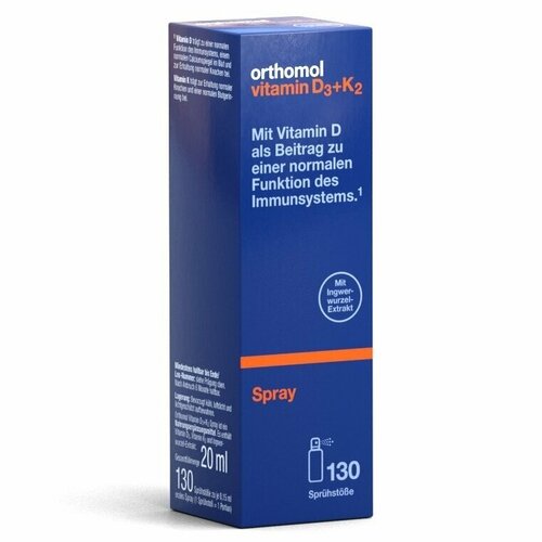 Orthomol Vitamin D3+K2 Spray — витаминный комплекс, направленный на укрепление иммунитета и поддержание здоровья костей. Спрей представляет собой диетическую добавку, состоящую из витаминов D3 и K2, с добавлением экстракта корня имбиря и освежающим апельcино-ментоловым вкусом.