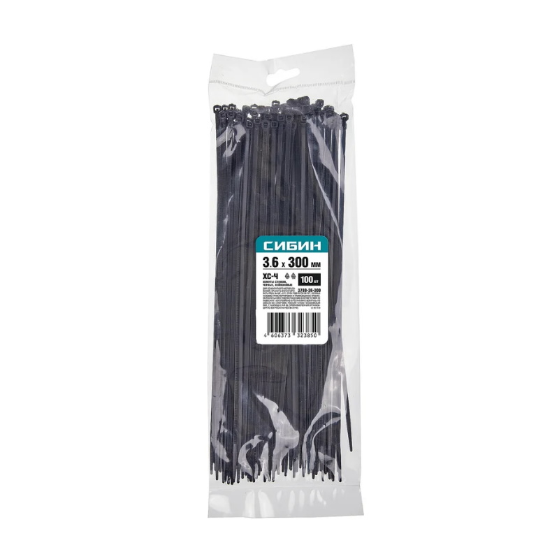 Хомуты-стяжки Сибин черные, 3.6 х 300мм, 100 шт, нейлоновые ХС-Ч 3788-36-300