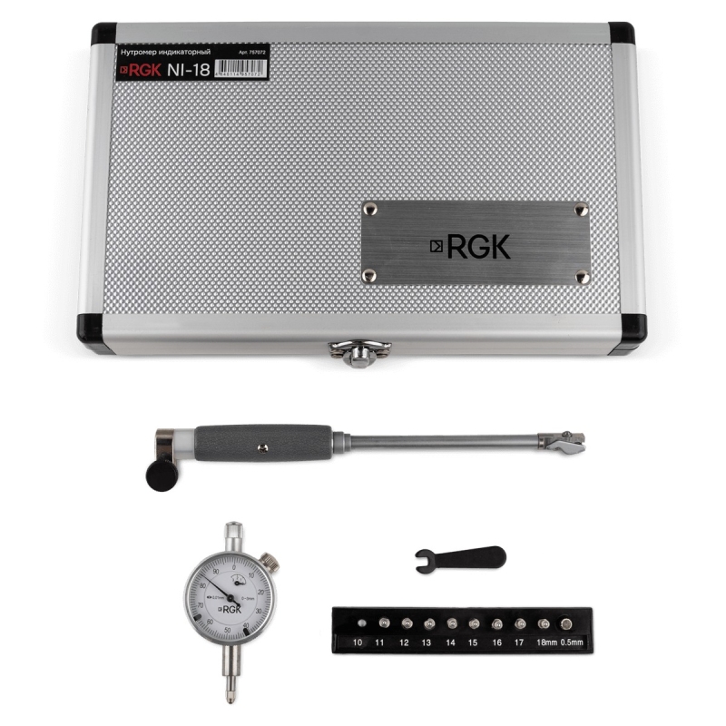 Нутромер RGK позволяет определять диаметр круглых отверстий и ширину канавок и пазов с параллельными стенками в диапазоне от 10 до 18 мм на глубине до 100 мм, представляя собой измеритель двухточечного типа, с подвижным измерительным элементом и неподвижным сменным стержнем калиброванной длины. Отклонения от образцового размера, относительно которого производится замер, определяется по показаниям стрелки часового индикатора. В комплект поставки входит набор измерительных стержней с шагом 1 мм от 10 до 18 мм и дополнительная проставка 0,5 мм, а также монтажный ключ и жесткий футляр.Преимущества Индикаторный нутромер RGK легко настраивается в нулевое положение для наглядности определения отклонений геометрических параметров объекта контроля от нормативного размера. Два указателя на наружном кольце, которые можно сдвигать относительно циферблата, позволяют ограничивать сектор допустимых показаний, упрощая оценку получаемых результатов измерений. Для предотвращения теплового расширения инструмента, приводящего к увеличению погрешности, на корпусе в месте хвата размещена ручка из теплоизолирующего материала.