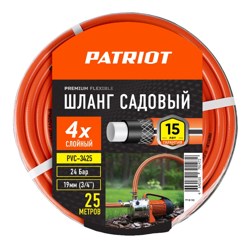 Шланг садовый Patriot 777001102, 4 слоя, 3/4 ", 25 м PVC-3425