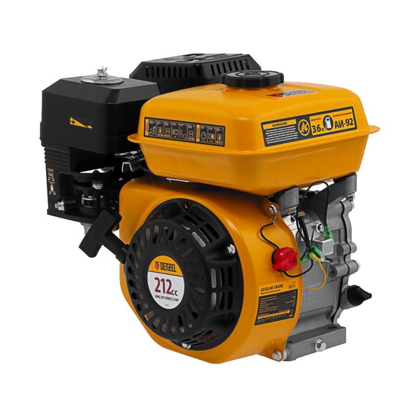 Четырехтактный бензиновый двигатель Denzel мощностью 7 л. с. и объемом 212 см3, с типом горизонтального вала шлиц 25 мм, имеет ручной старт и воздушное охлаждение. Устанавливается на бензотехнику: мотоблоки, садовые измельчители, мотопомпы, виброплиты, мойки высокого давления. Обеспечивает бесперебойное функционирование оборудования и эффективное выполнение сельскохозяйственных, строительных работ, а также решение прочих задач на загородном участке.Преимущества Эффективность — шлицевой выходной вал улучшает передачу крутящего момента Экономичность — вместительный бак в сочетании с низким расходом топлива позволяет длительное время работать без дозаправки (до 3,5 часов) Надежная система запуска — усовершенствованное электронное зажигание обеспечивает уверенный и быстрый старт Защита от поломки — при низком уровне масла двигатель не запустится Высококачественные комплектующие — свеча зажигания Bosch, надежные узлы и детали обеспечивают длительную стабильную работу даже в условиях повышенных нагрузок Простая подготовка к работе — удобная горловина облегчает заливку масла Долговечность — оптимизированная система охлаждения предотвращает риск перегрева Защита от попадания посторонних частиц — воздушный фильтр предотвращает попадание грязи и пыли, препятствуя выходу двигателя из строя Регулировка оборотов — изменение положения рычага позволяет контролировать производительность приводимого в движение устройства Совместимость с разным типом оборудования — мотоблоки 56403, 56406, 56433 и др Гарантия 3 года — высокое качество двигателя подтверждено производителем