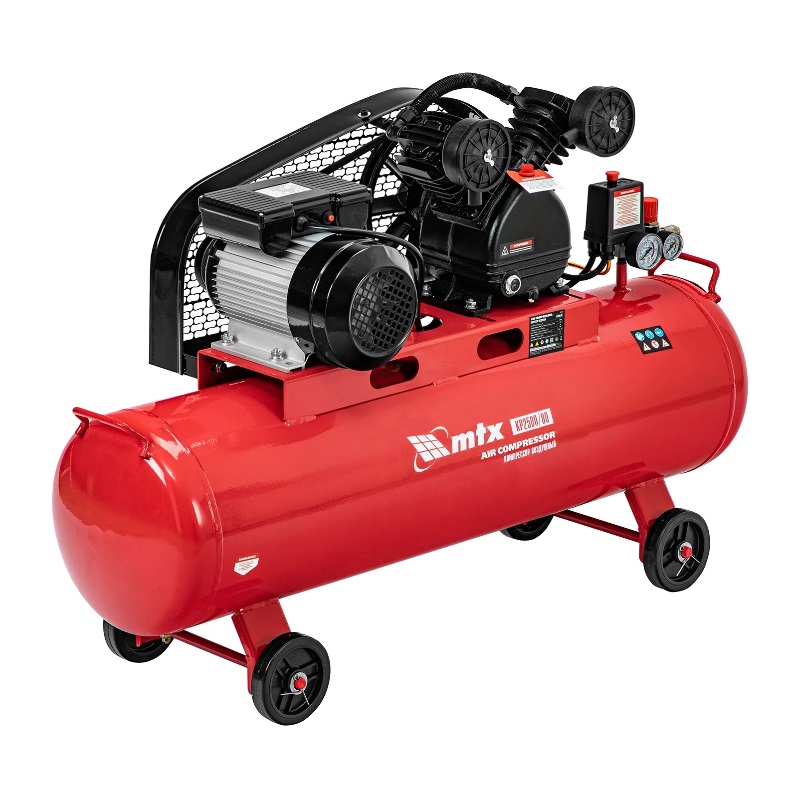 Компрессор воздушный МТХ с ременным приводом от электродвигателя, мощностью 2,5 кВт и производительностью 420 л/мин, с ресивером объемом 80 литров, применяется для подачи сжатого атмосферного воздуха к пневматическому инструменту. К нему можно подключить гайковерт, дрель, углошлифовальную машину, степлер, краскопульт, продувочный пистолет или другой пневмоинструмент. Для подключения предусмотрены 2 штуцера: быстросъемный и «елочка». Компрессор подходит для профессионального использования на предприятии автосервиса, строительной площадке, в мастерской.Преимущества Термозащита — при перегреве электропитание автоматически отключается, обмотки статора размыкаются, что позволяет сохранить ресурс двигателя Защита от перегрузки — при превышении максимально допустимой величины тока компрессор отключается для предотвращения поломки Безопасная эксплуатация — предохранительный клапан не допускает превышения максимально допустимого давления в ресивере Автоматическая регулировка производительности — прессостат останавливает двигатель при достижении максимального рабочего давления (8 бар) и запускает его при падении давления ниже минимально допустимого уровня Повышенный ресурс — блоки цилиндров из чугуна выдерживают длительную эксплуатацию, дополнительные ребра на них повышают эффективность охлаждения Износостойкость — благодаря увеличенной емкости масляного картера все детали воздушного компрессора обеспечены достаточной смазкой Удобный контроль давления в ресивере и пневмомагистрали — компрессор оснащен двумя механическими манометрами Простая подготовка к работе — подключение пневмоинструмента к быстросъемному коннектору занимает несколько секунд Мобильность — колеса и рукоятки облегчают перемещение компрессора по рабочей площадке Готовность к работе — в комплект поставки входит сапун и компрессорное минеральное масло марки L-DAB 68 (250 мл)