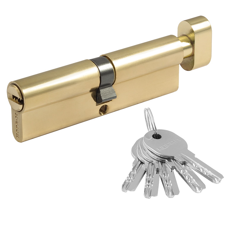 Цилиндр замка Нора-М 7187, личинка ЛПУВ с вертушкой, золото - латунный цилиндр для межкомнатных и входных дверей.Преимущества 6 пинов, в комплекте 5 перфорированных ключей из латуни Цилиндр имеет штифт из закаленной стали против высверливания и вертушку для удобного запирания изнутри помещения без использования ключа Ресурс работы более 100.000 циклов Длину цилиндра подбирайте исходя из толщины двери, с небольшим запасом под накладку