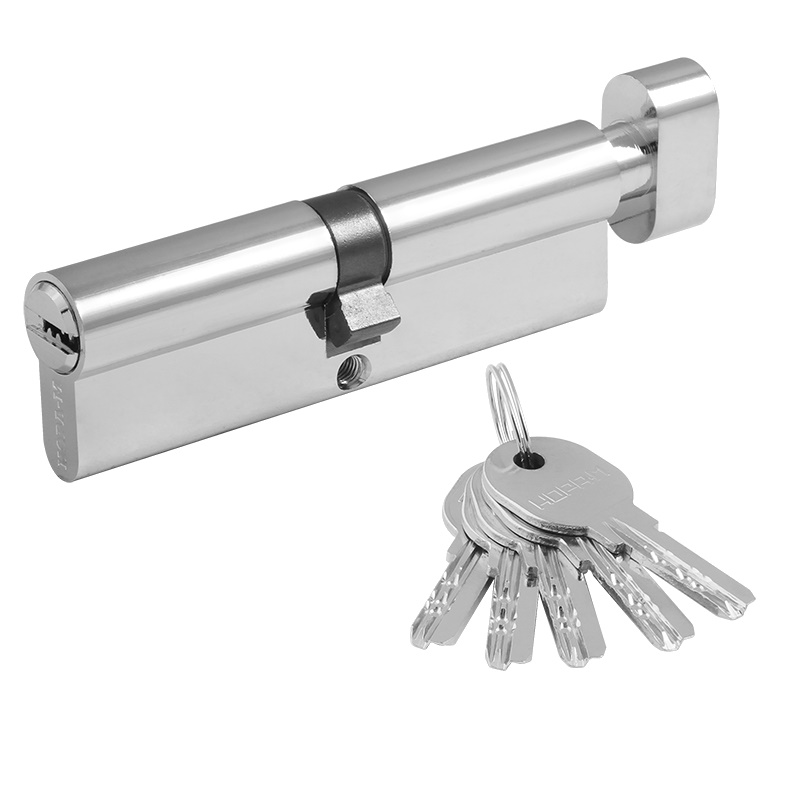 Цилиндр замка Нора-М , личинка ЛПУВ с вертушкой, хром - латунный цилиндр для межкомнатных и входных дверей.Преимущества 6 пинов, в комплекте 5 перфорированных ключей из латуни Цилиндр имеет штифт из закаленной стали против высверливания и вертушку для удобного запирания изнутри помещения без использования ключа Ресурс работы более 100.000 циклов Длину цилиндра подбирайте исходя из толщины двери, с небольшим запасом под накладку