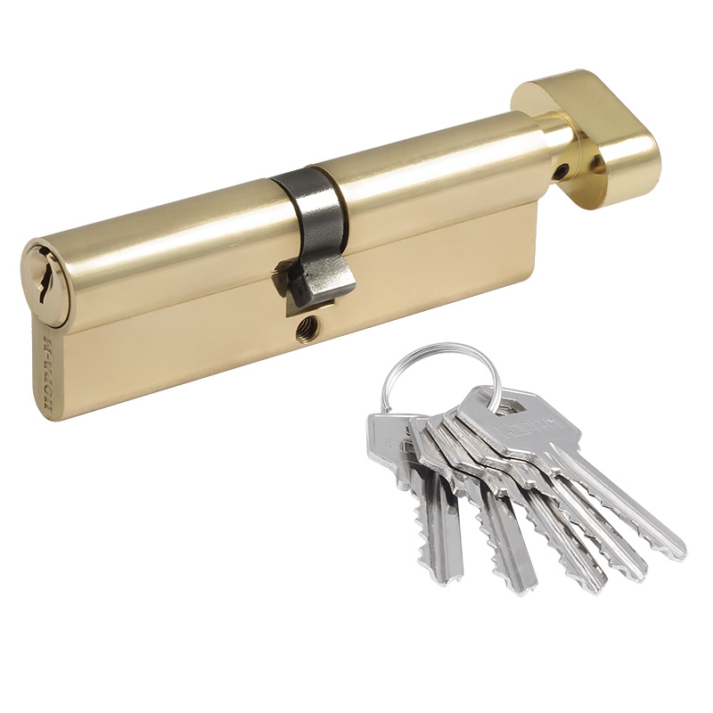 Цилиндр замка Нора-М , личинка ЛУВ с вертушкой, золото - латунный цилиндр для межкомнатных и входных дверей.Преимущества 5 пинов, в комплекте 5 английских ключей из латуни Цилиндр имеет штифт из закаленной стали против высверливания и вертушку для удобного запирания изнутри помещения без использования ключа Ресурс работы более 100.000 циклов Длину цилиндра подбирайте исходя из толщины двери, с небольшим запасом под накладку