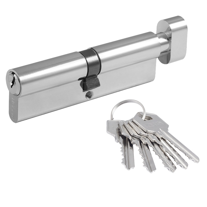 Цилиндр замка Нора-М , личинка ЛУВ с вертушкой, хром - латунный цилиндр для межкомнатных и входных дверей.Преимущества 5 пинов, в комплекте 5 английских ключей из латуни Цилиндр имеет штифт из закаленной стали против высверливания и вертушку для удобного запирания изнутри помещения без использования ключа Ресурс работы более 100.000 циклов Длину цилиндра подбирайте исходя из толщины двери, с небольшим запасом под накладку