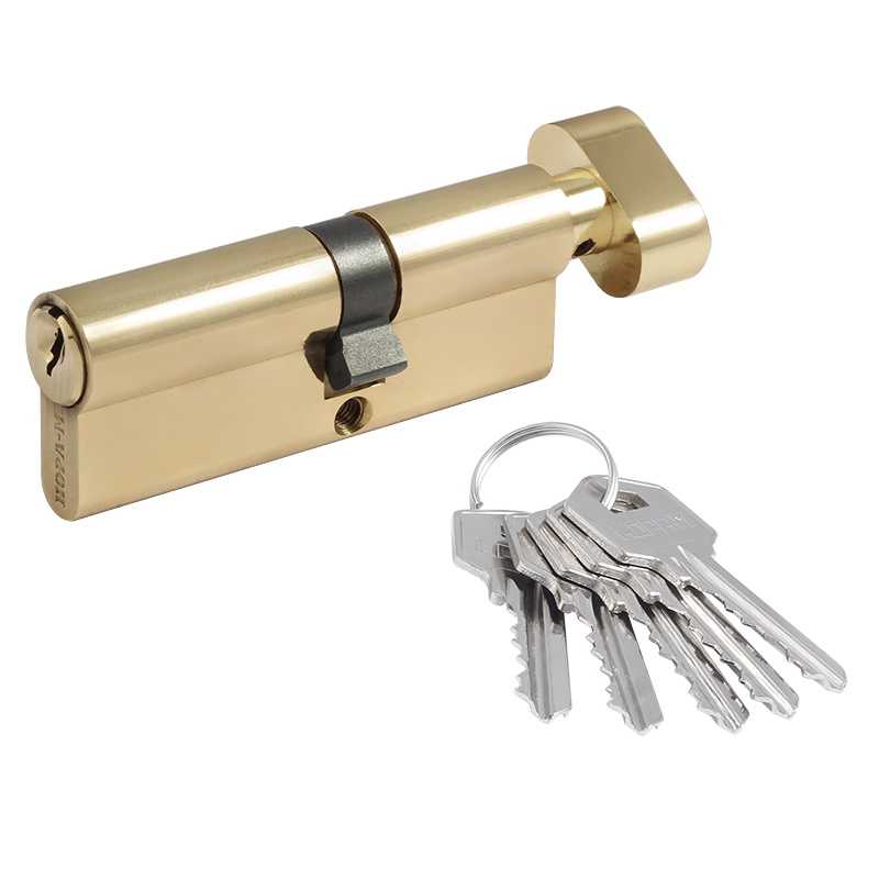 Цилиндр замка Нора-М , личинка ЛУВ, асимметричный, с вертушкой, золото - латунный цилиндр для межкомнатных и входных дверей.Преимущества 5 пинов, в комплекте 5 английских ключей из латуни Цилиндр имеет штифт из закаленной стали против высверливания и вертушку для удобного запирания изнутри помещения без использования ключа Ресурс работы более 100.000 циклов Цилиндр асимметричный, то есть имеет разное соотношение сторон по длине относительно центра Длину цилиндра подбирайте исходя из толщины двери, с небольшим запасом под накладку