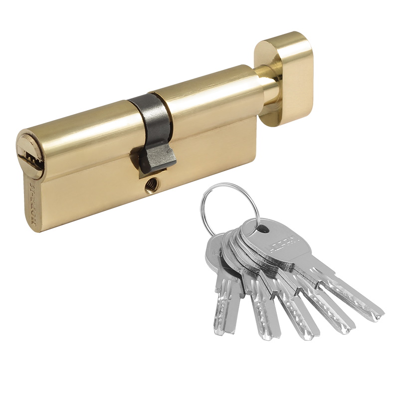 Цилиндр замка Нора-М , личинка ЛПУВ.УК, с вертушкой, золото - латунный цилиндр для межкомнатных и входных дверей. Длину цилиндра подбирайте исходя из толщины двери, с небольшим запасом под накладку.Преимущества 6 пинов, в комплекте 5 перфорированных удлиненных ключей из латуни Цилиндр имеет штифт из закаленной стали против высверливания и вертушку для удобного запирания изнутри помещения без использования ключа Ресурс работы более 100.000 циклов