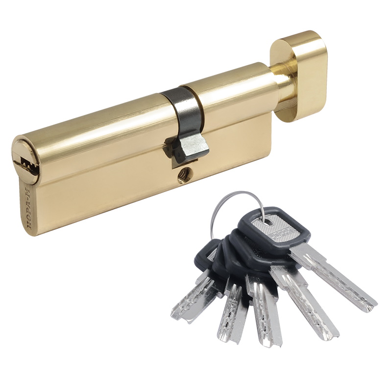 Цилиндр замка Нора-М , личинка ЛПУВ.УК, асимметричный, с вертушкой, золото - латунный цилиндр для межкомнатных и входных дверей. Длину цилиндра подбирайте исходя из толщины двери, с небольшим запасом под накладку.Преимущества 6 пинов, в комплекте 5 перфорированных удлиненных ключей из латуни Цилиндр имеет штифт из закаленной стали против высверливания и вертушку для удобного запирания изнутри помещения без использования ключа Ресурс работы более 100.000 циклов Цилиндр асимметричный, то есть имеет разное соотношение сторон по длине относительно центра
