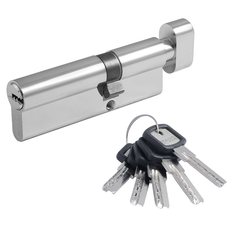 Цилиндр замка Нора-М , личинка ЛПУВ.УК, асимметричный, с вертушкой, хром - латунный цилиндр для межкомнатных и входных дверей. Длину цилиндра подбирайте исходя из толщины двери, с небольшим запасом под накладку.Преимущества 6 пинов, в комплекте 5 перфорированных удлиненных ключей из латуни Цилиндр имеет штифт из закаленной стали против высверливания и вертушку для удобного запирания изнутри помещения без использования ключа Ресурс работы более 100.000 циклов Цилиндр асимметричный, то есть имеет разное соотношение сторон по длине относительно центра