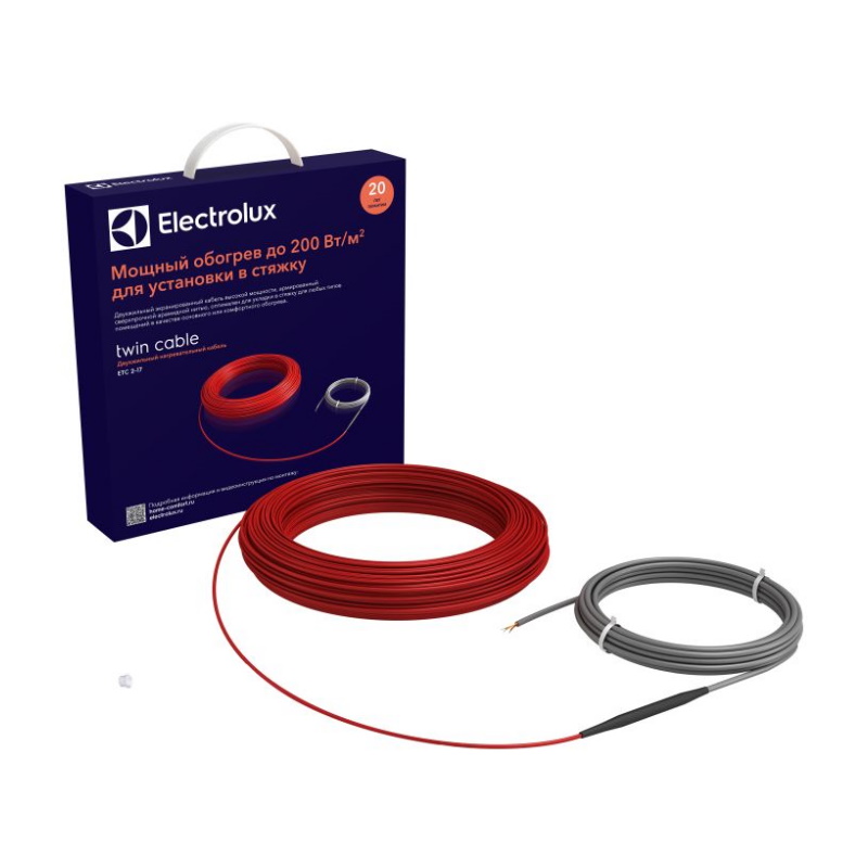 Twin Cable — тонкий и прочный двухжильный нагревательный кабель высокой мощности, с надежной трехслойной изоляцией. Основу кабеля составляет сверхпрочная арамидная нить, на которую навиты нагревательные жилы. Все нагрузки приходятся на арамидную нить за счет того, что длина жил на 6% больше длины кабеля. Легко и безопасно создавайте необходимую конфигурацию теплого пола. Electrolux TWIN CABLE — это идеальное решение для организации теплого пола, в качестве основного или дополнительного источника тепла.Преимущества Быстрый обогрев. За счет двойного греющего проводника можно быстро добиться желаемого микроклимата в помещении. Данный кабель можно укладывать в бетон, плиточный клей или под камень Надежность. Данный нагревательный кабель оснащен плетеным медным экраном. Укладка в стяжку Кабель рекомендуется для укладки в бетонную стяжку, подходит для помещений со сложной конфигурацией Удобство монтажа. Конструкция позволяет перегибать данный кабель, не опасаясь обрыва или слома жил. Это достигается за счёт уникальной конструкции тонких витых греющих жил, длина которых больше длины кабеля на 6%. При деформациях или растяжениях нагрузка приходится на арамидную жилу, а греющие проводники легко адаптируются к изменению радиуса сгиба Двужильный кабель диаметром 4,5 мм Кабель через тонкую соединительную муфту соединяется с кабелем питания длиной 2 метра, необходимым для подключения кабеля питания к терморегулятору Одностороннее подключение кабеля питания существенно упрощает монтаж теплого пола Electrolux ETC Тонкая герметичная муфта позволяет сократить высоту подъема уровня пола и обеспечивает высокую надежность системы Прочная арамидная жила и трехслойная изоляция надежно защищают кабель от случайных повреждений и перегрева в течение всего срока службы