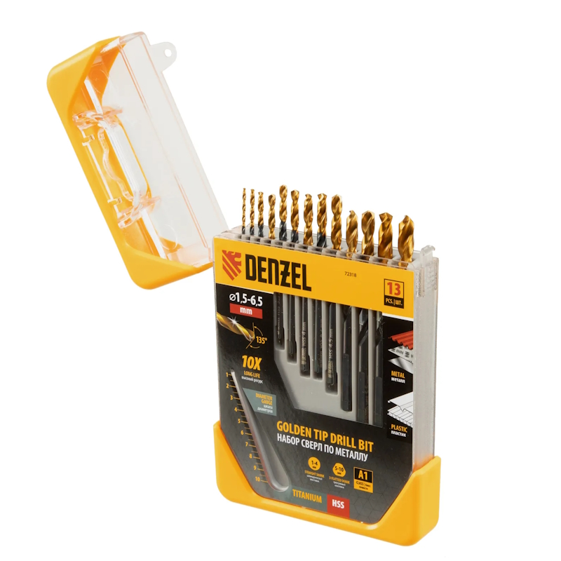 Набор сверл по металлу Denzel , 1,5-6,5 мм, HSS-Tin, Golden Tip, 13 шт 72318